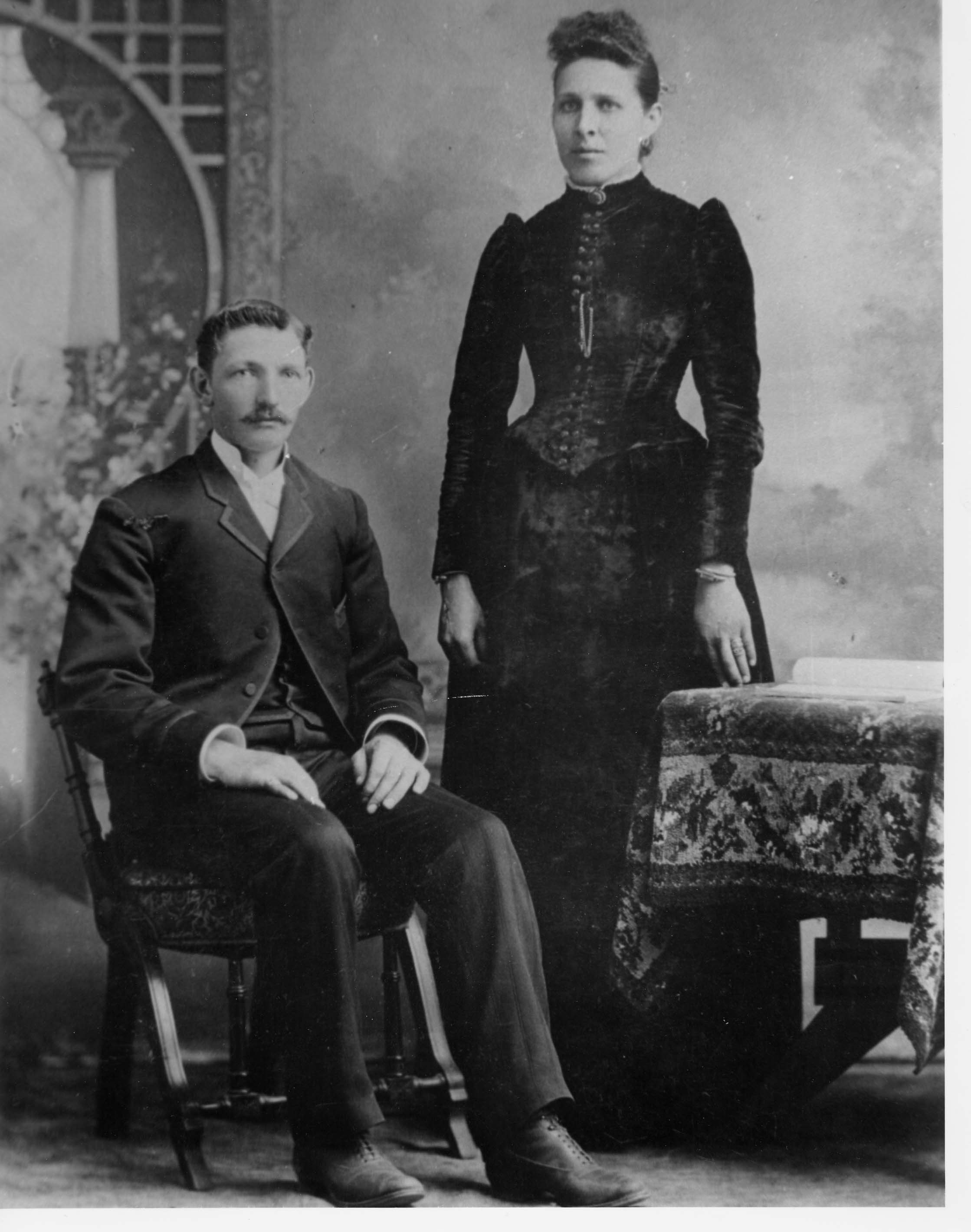 Studio portrait of Robert McCullough (1855-1937) and his wife, Isabella "Bella" Galloway. Robert is dressed in a suit and is seated in a chair while Bella stands to his left in a long black dress with her hair elaborately styled. They lived on the south half of lot 15, concession 5 until they eventually sold their property and moved to Toronto. Their children, a boy and a girl, were named Roy and Lula.