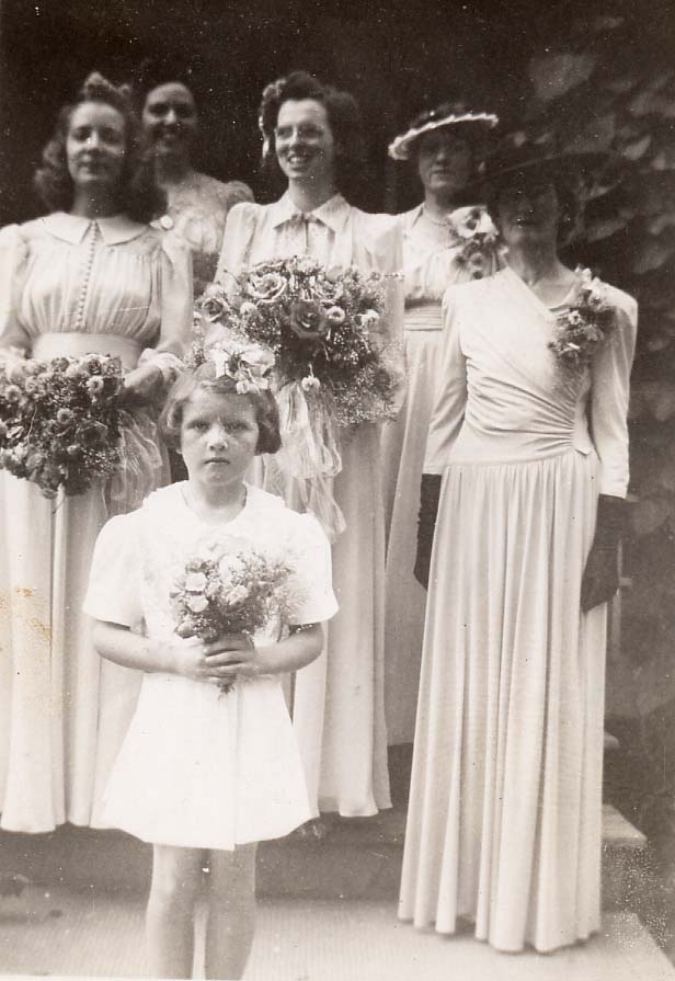 Following wedding of Lillian Davis - stepdaughter of T. McKnight in July 1942. Marjorie Davis, Joan Lawrence, Ruth Noble, Mrs. Wilkinson-mother of groom Walter Wilkinson, and Mrs. McKnight-mother of the bride.