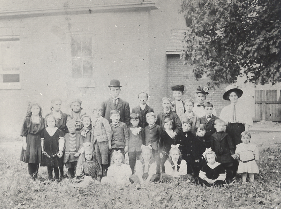 Big Bay Point School c. 1907. Teacher Frank Scott Mrs. Robert Webb was the mother of Camilla, Erma. Harold, Maurice and Roger Webb. Mildred was a cousin (daughter of George Webb). Allan Black was also a cousin of the Webbs (son of Mrs. Bertha (Webb) Black. Mrs. Young was Mrs. Robert Webb's mother. All the Mayors were brothers and sisters. Same for all Armsrongs, Irwins, Guests in the photo Costumes Schools