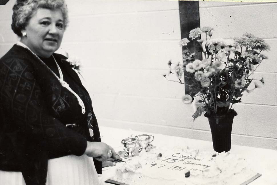 Image of Anne Monkman, President of the Cookstown Women's Institute, cutting a cake. The cake is in celebration of the 75th Anniversary of the Cookstown Women's Institute. The celebrations took place at Cookstown Central School in 1976. In the image, Anne Monkman wears a blouse and skirt, cutting the cake which is placed on a table that is decorated with flowers.
