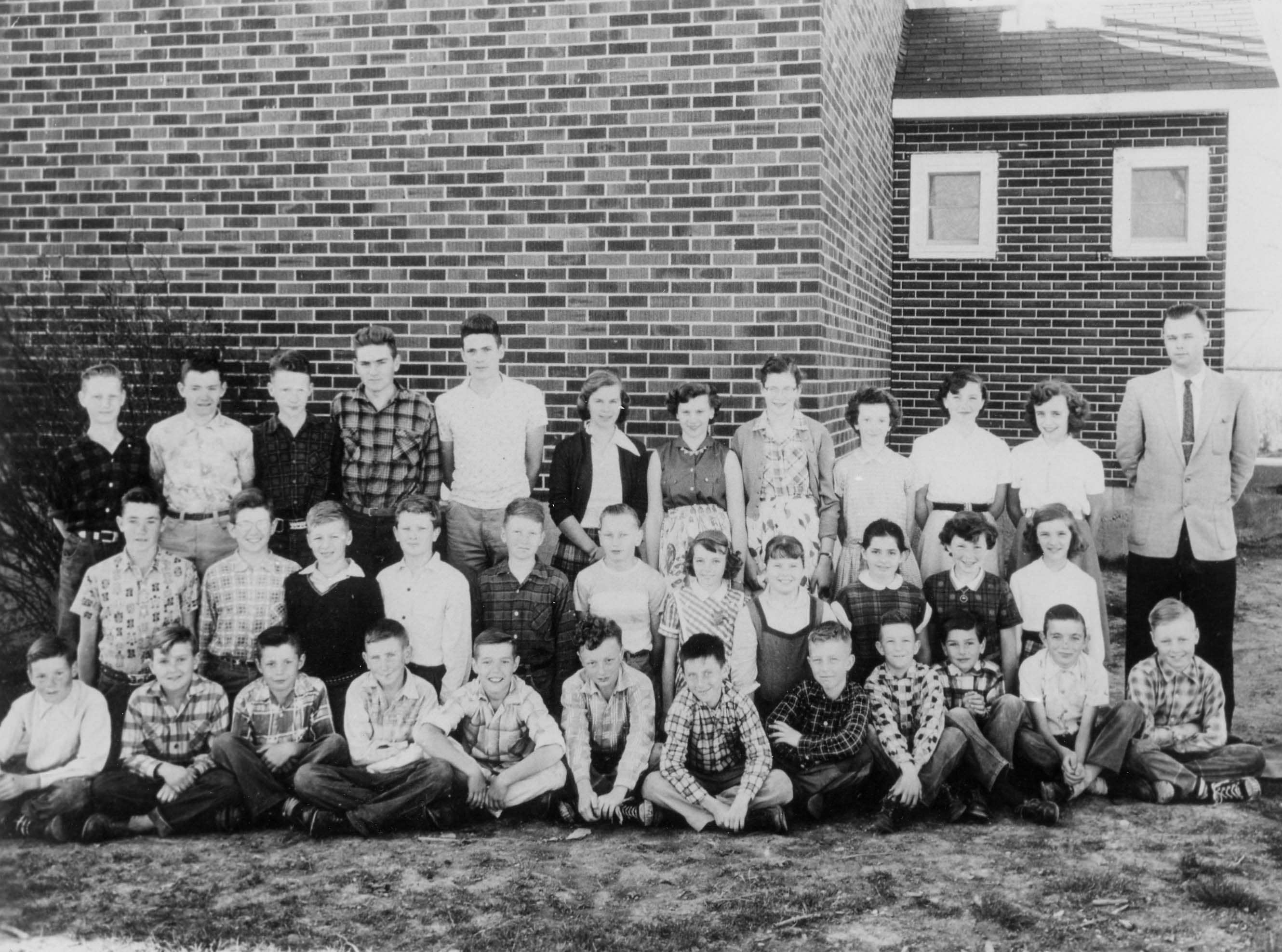 Front row left to right: (Don) Duke McCullough, Ivan Pratt, Wayne Neely, Norman Sammons, Ian Constable, Albert Harris, Paul Terrell, Donnie Shakell, Robert Reive, Gene Nichols, Dale Neely, Lloyd Harris Second row: Gary McCullough, Craig Hunter, Allan Thompson, Jimmie Fitzsimmins, John Lucas, Kenny Shakell, Linda Fagan, Doreen Hunter, Bonnie Constable, Judy Lockhart, Donna Keown Back Row: Jack Atkinson, Leonard McCullough, Stewart King, Lloyd Grant, Ricky Fotherby, Ann Vasilaskus, Joan Shakell, Martha Fitzsimmins, Linda Browning, Carol Graham, Colleen Gould, George Jamieson (teacher).