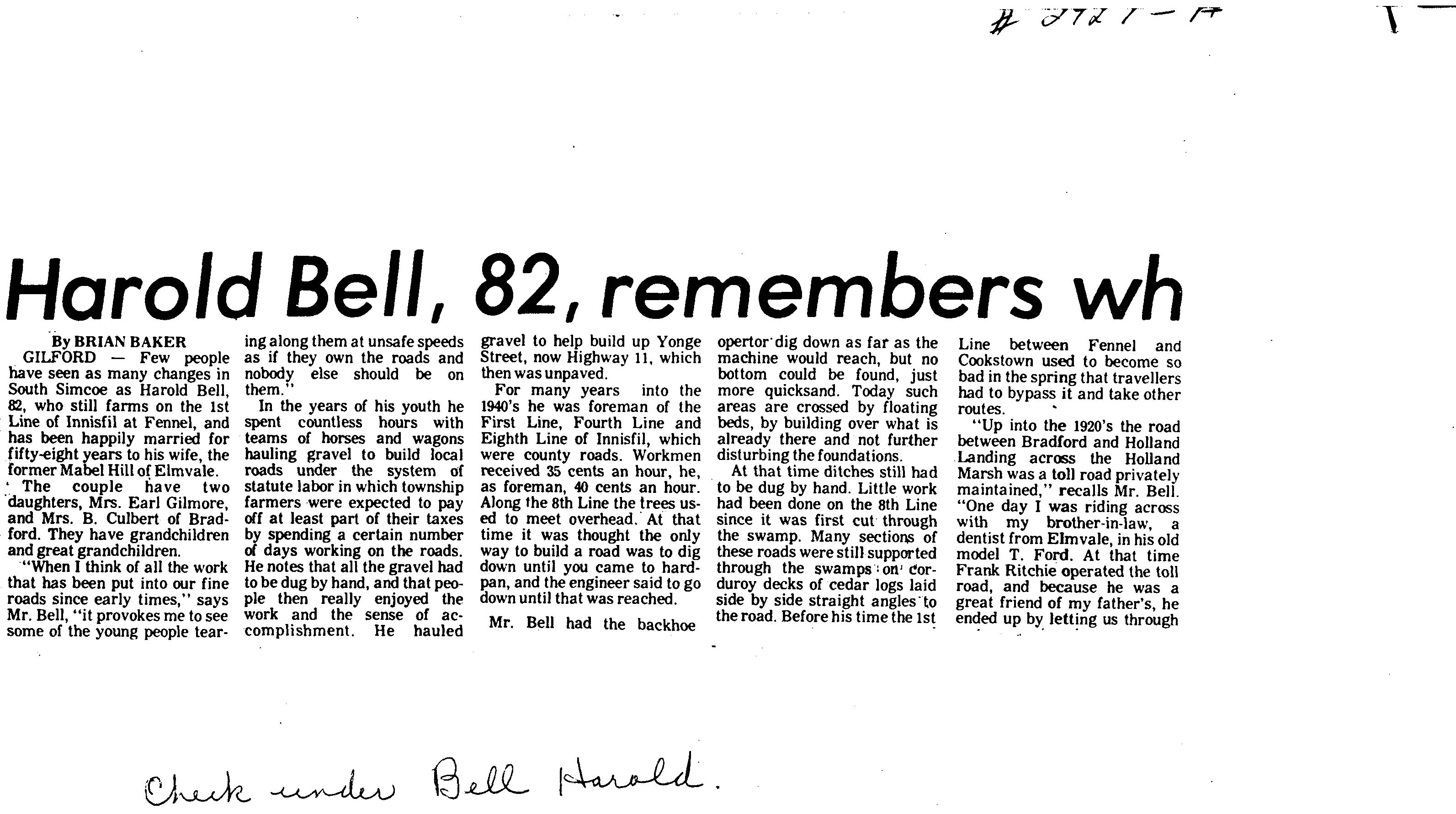 Clipping from Barrie Examiner's Marketplace; re: "Harold Bell, 82, remembers"- he farmed on 1st Line of Innisfil at Fennels.