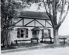 Photo of the exterior of the home of Mr. and Mrs. Bill Stevenson. The small house has a rustic appearance with shutters on the two front windows, a split rail fence across the front yard, two large trees near the entrance path and side, and a distinctive timber framing design across the front of the house on the second storey.
