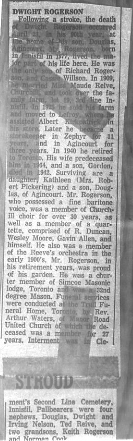 Obituary of Dwight Rogerson, son of Richard Rogerson and Cassie Willson, husband of Maude Reive, and father of Gordon (died in 1942), Kathleen (married to Robert Pickering), and Douglas.