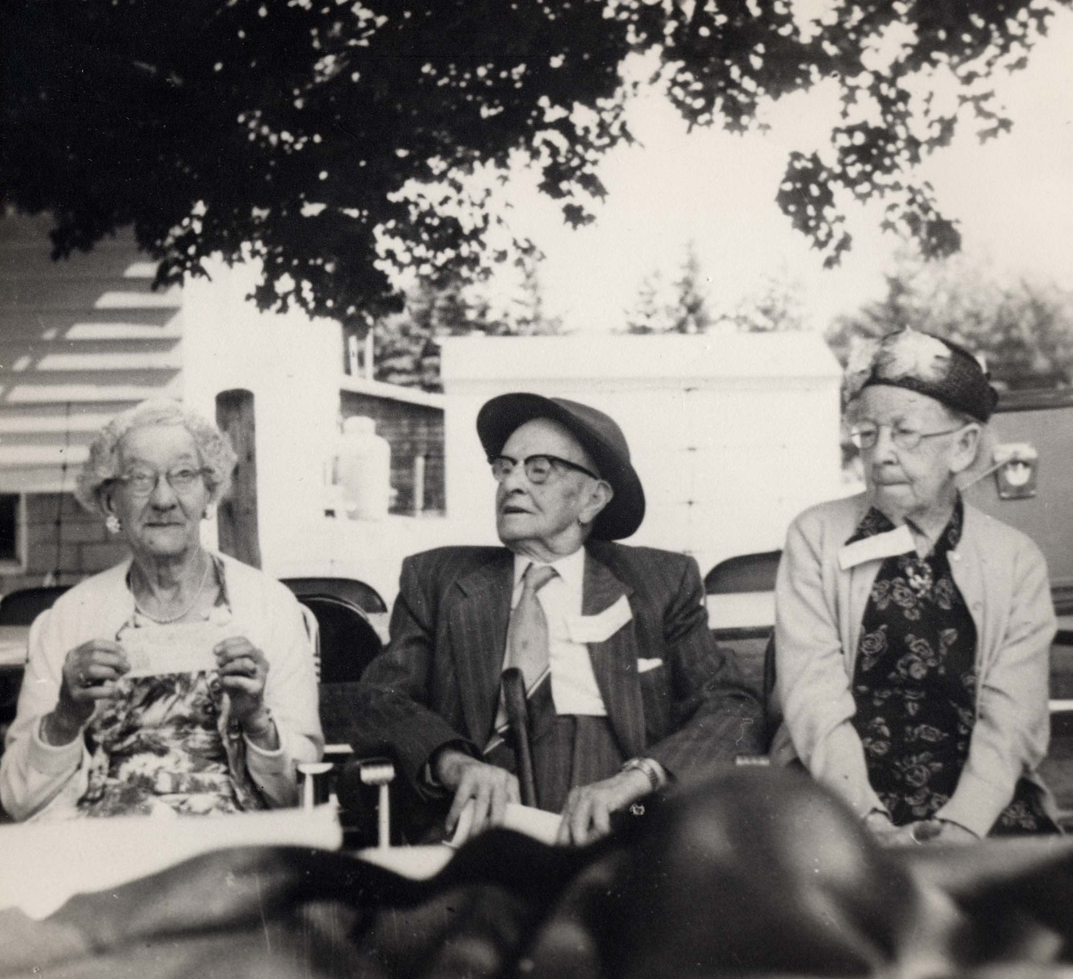 Photo of Annabelle (neé Lucas) Noble, Ed Sloan, and Phoebe (neé Taylor) Gibbons taken at the closing of Fifth Line School in Tyrone.