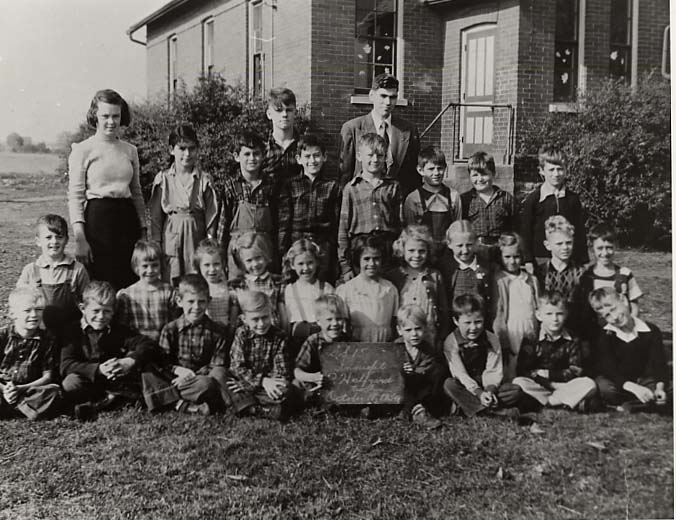 Front row: Earl Shannon, James Sturgess, Gordon Cowan, Andrew Cowan, Herb Shannon, George Burns, Terry Webb, Ronald Cowan, Ian Grey. Second row: Merv. Wice, Dawn Sturgess, Margaret Cowan, Wendy Grey, Marion Gibbons, _______, Kathleen Burns, Ella Kelsey, Mary Sturgess, George Burns, Selby Bowman. Third row: Dorothy Shannon, Dorothy Gibbons, Donnie Gibbons, Wayne Martin, Donald Shannon, Mike Webb, Frank Hogg, David Sturgess Back row: Bev. Cochrane, Bob Halfyard (teacher).