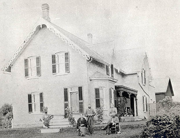 Standing - John Kidd and his wife Fanny Barnes Kidd Sitting - Mr. Emory Forsyth and Mrs. Forsyth This light brick house was built by Mr. Forsyth before 1892 at the corner of Victoria St. East and Highway 27 south. There are now after 1944 three bedrooms and a bathroom upstairs and after 1976 a room in the attic built by Doughtys. There was a very large kitchen, combination living and dining room and large front hall. The barn behind was used to house animals, pigs and chickens. This home was purchased by Arthur Kidd from the executors of the John Robinson Estate in October 15, 1944 for $1,100.00. Taxes were $51.60. The property was purchased from the Kidds by Christopher Doughty in April 1976. Picture donated by Mr. and Mrs. Arthur Kidd.
