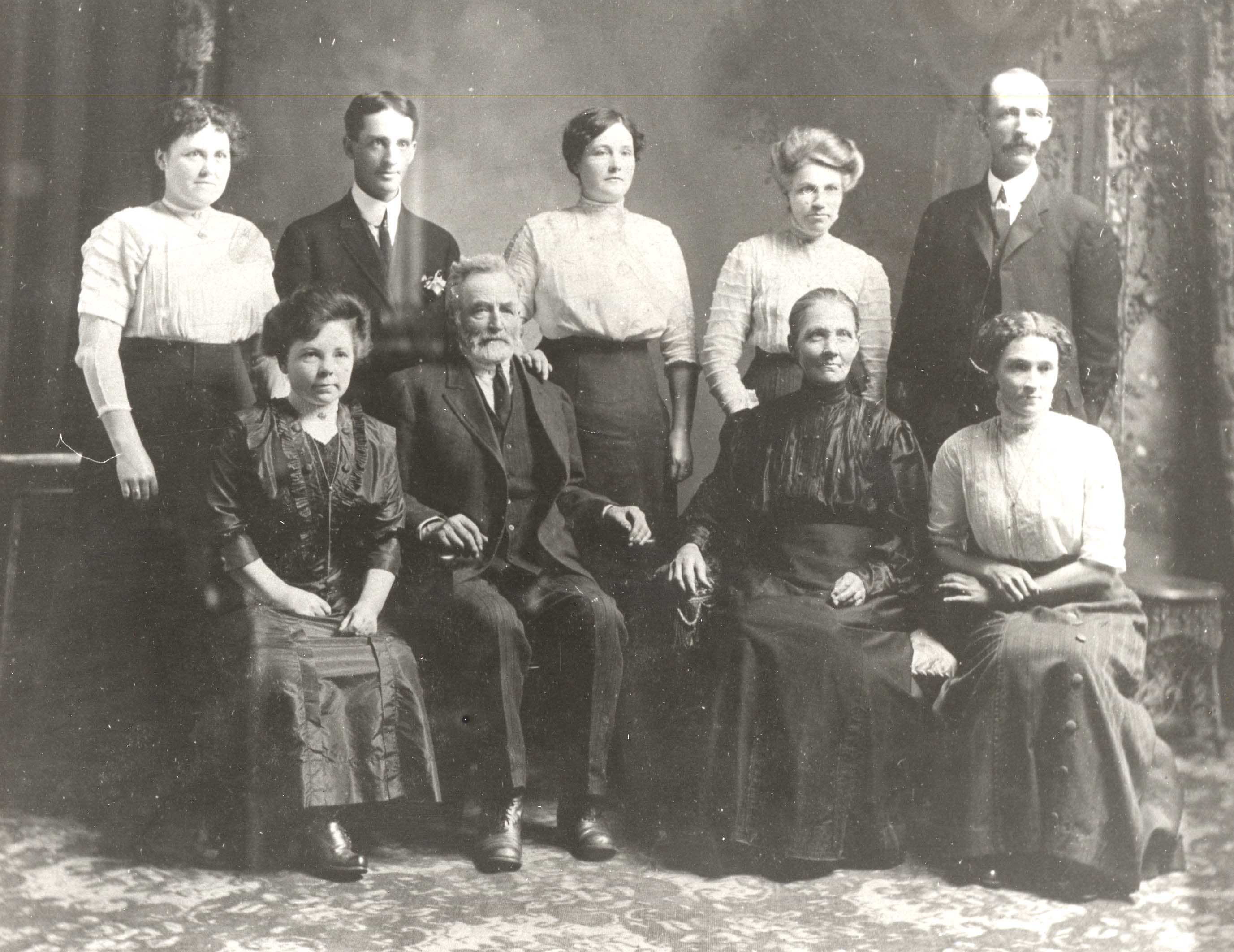 Robert Rogers(1836-1928) and his wife Elizabeth Allen (1854-1937) with their family: Standing (l to r): Libbie (Mrs. Albert Dawson), Robert,Jennie (Mrs. Frank Hindle), Mary (Mrs. Harry Kelsey, William Seated: Isobelle, Robert and Elizabeth (parents) Margaret, (Mrs. George Robertson), (second marriage Mrs. Frank Hindle), Lula (died early) Libbie (1890-1965), Margaret (1885-1964), Jennie(1881-1936), William (1879-1959), Bob (1887- 1970), Mary (1876-1955)