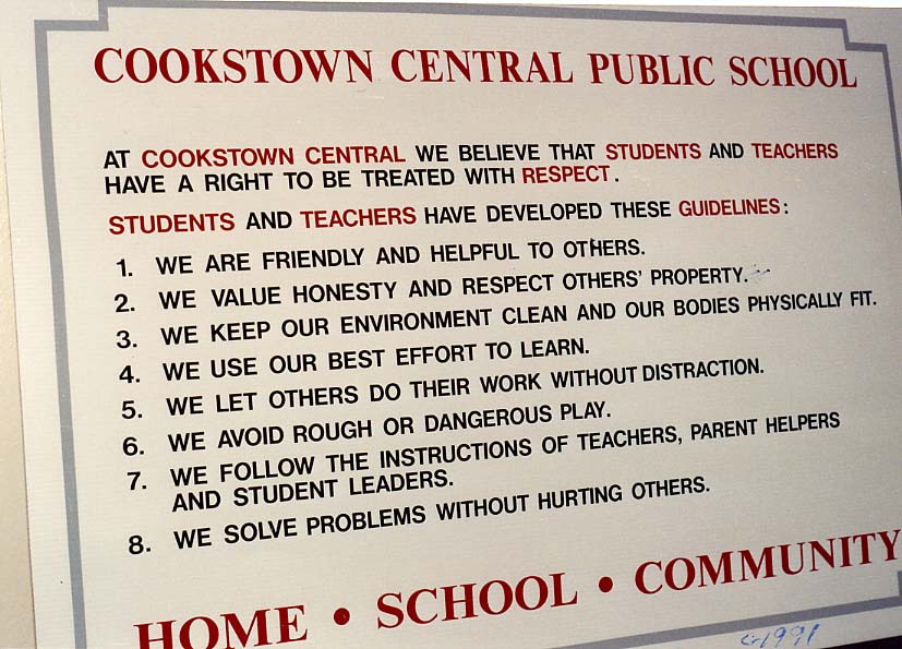 Photograph of a sign using black and red text posted at Cookstown Central Public School detailing guidelines of behaviour at school. The sign reads: "At Cookstown Central we believe that students and teachers have a right to be treated with respect. Students and teachers have developed these guidelines: 1. We are friendly and helpful to others. 2. We value honesty and respect others' property. 3. We keep our environment clean and our bodies physically fit. 4. We use our best effort to learn. 5. We let others do their work without distraction. 6. We avoid rough or dangerous play. 7. We follow the instructions of teachers, parent helpers and student leaders. 8. We solve problems without hurting others." The words home, school, and community are listed at the bottom and a small "1991" is written in blue ink in the bottom right corner.