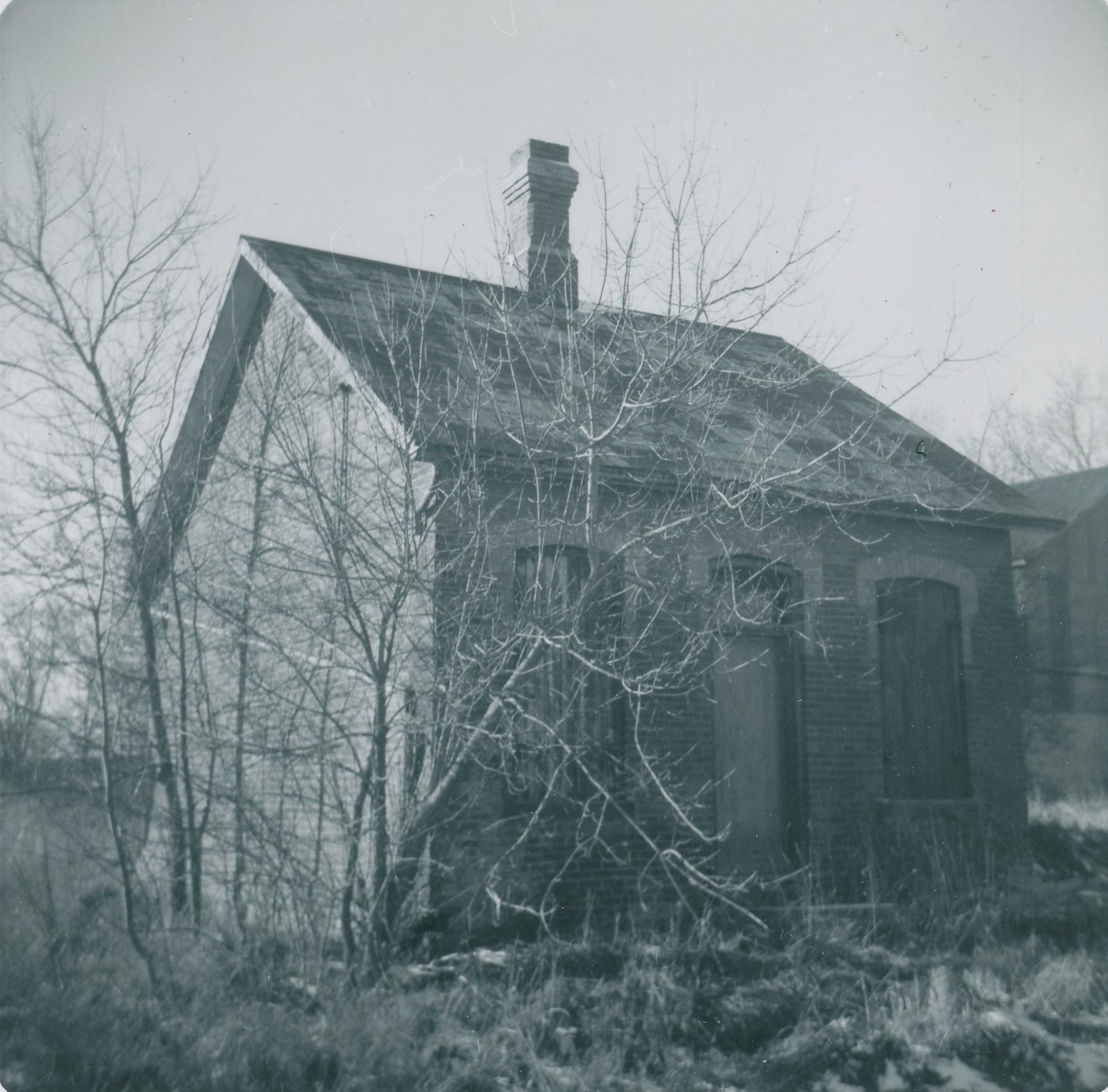 Photo of the exterior of Cookstown's lock-up, which was constructed in 1877 as a second class jail containing three cells and a toilet room. The idea for the lock-up was originally proposed in 1865 and was granted $200 by the County Council towards its construction in 1868. After the railroad was built in Cookstown in 1879 the lock-up received an additional $400 to help contain transients who came in and out of town via train. The building went unused for a number of years as criminals and transients were taken to the Barrie jail. The deed to the building was eventually given to the municipality, and later traded to George Caldwell. The building was then rented for storage at a cost of $40 a year. By 1973 local residents began a movement to have the building designated as an historic site but high costs to bring it up to building codes meant the building fell into disrepair. By 1983 the building was entirely dismantled. This black and white photo was taken in 1965 and shows the small red brick building with an open gable roof, single chimney, and two windows flanking either side of the only door.