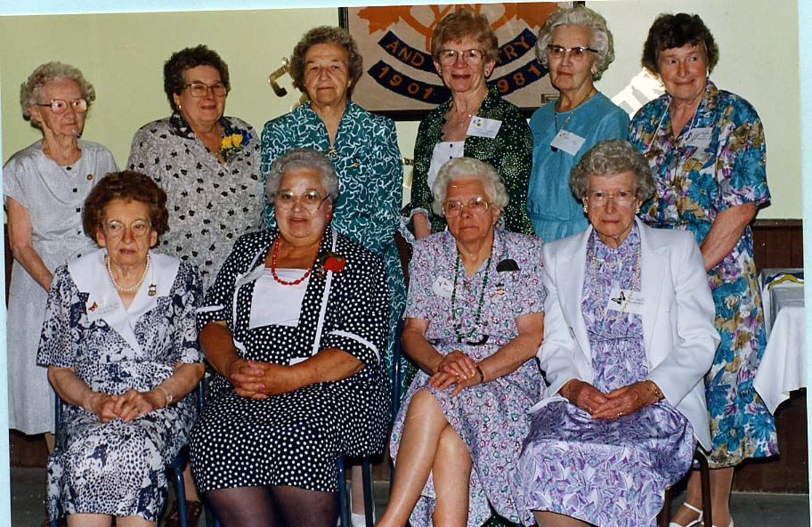 Coloured photograph showed members of the 1991 Cookstown Women's Institute, that attended the meeting. There are two rows of women: six in the back standing, and four in the front seated. Back Row (L to R)- Delilah (Dell) Evans, Florence Ley, Olive Parker, Stella Webster, Cissie Sharp, Joan McLean. Front Row - Muriel Smith, Anne Monkman, Hazel Trotter (d.1993), Eva Carter.