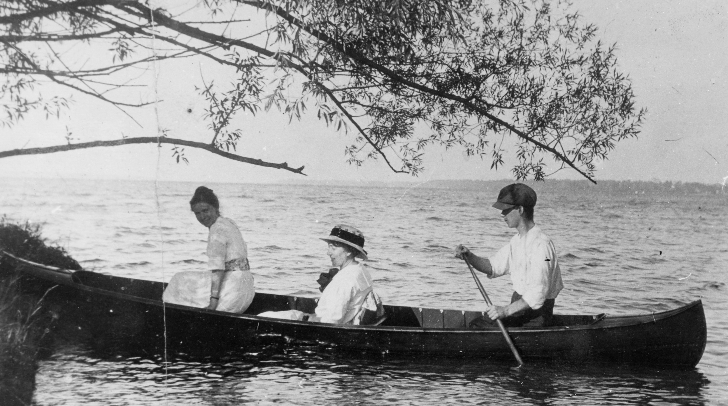 Candid photo of a canoe with three passengers off of Killarney Beach, near Concession 4 of Innisfil. There are two ladies sitting nearing the front, both in long white dresses and one wearing a sunhat, while a man in a white shirt and newsboy cap paddles at the rear. Killarney Beach Park was a popular spot for picnics and leisure activities before Innisfil Beach Park on Concession 8 was purchased.