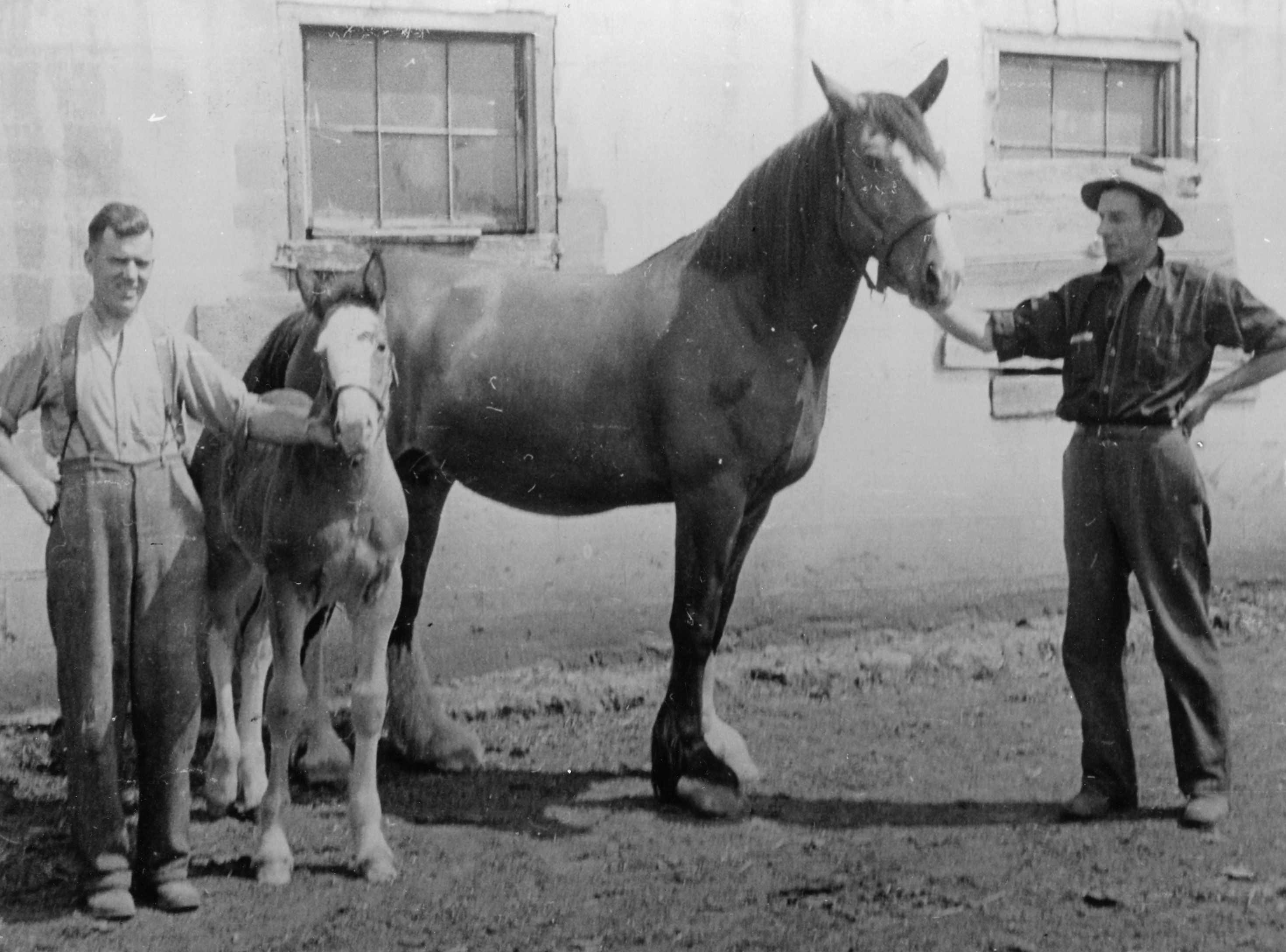Photo of Parker Peacock and Fraser Sutherland standing beside a farm building with a large, fully grown horse as well as a prize winning colt owned by Parker's father, Fred Peacock. Parker was the fifth generation of Peacocks to live on the family farm in Innisfil, north half of lot 14 on the eighth concession. The founder of the farm was Captain John A. Peacock, a British army veteran of Cadiz, Gibraltar, Spain, and the Battle of Waterloo. This photo appears on page 60 of the Stroud Tweedsmuir History, volume II.