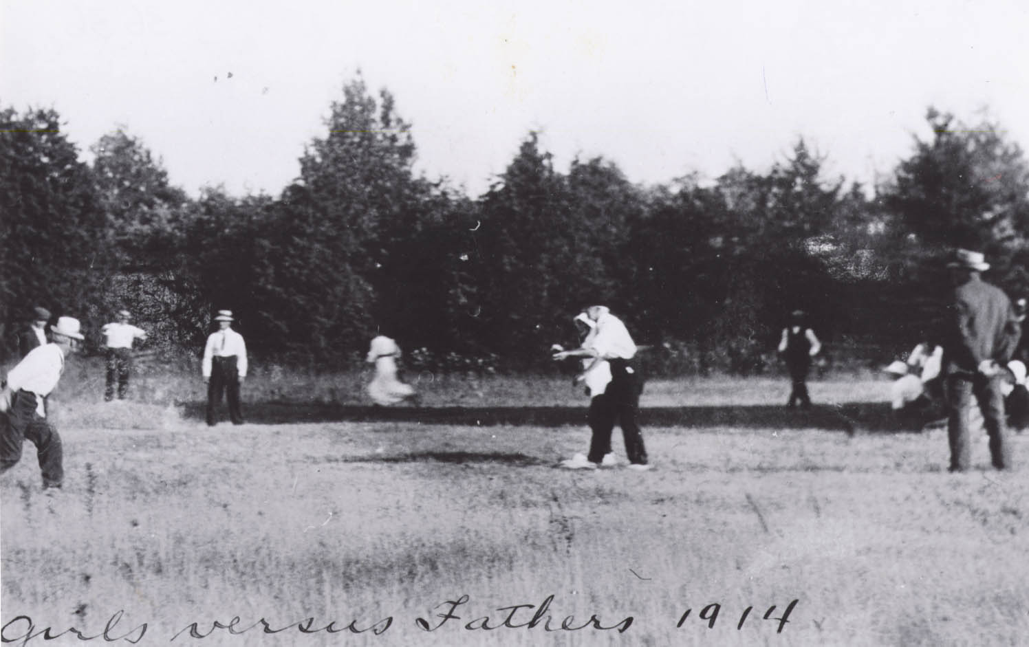 Candid photo of a softball game in Belle Ewart of girls vs. their fathers in 1914. The men visible in the photo are wearing long pants, long sleeved white shirts, and boater hats, and the game appears to have taken place in a small field or clearing.