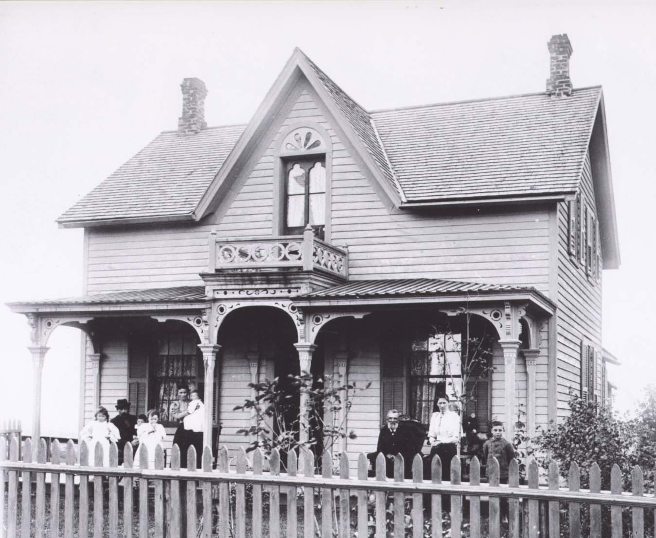 Image taken around the 1900s of the Barry Family home. The family can be seen positioned on the front porch of their house for the image. The house is suspected to be gothic revival in style. It was located to the East of the railway in Lefroy, on the North side. The house has since burnt down.