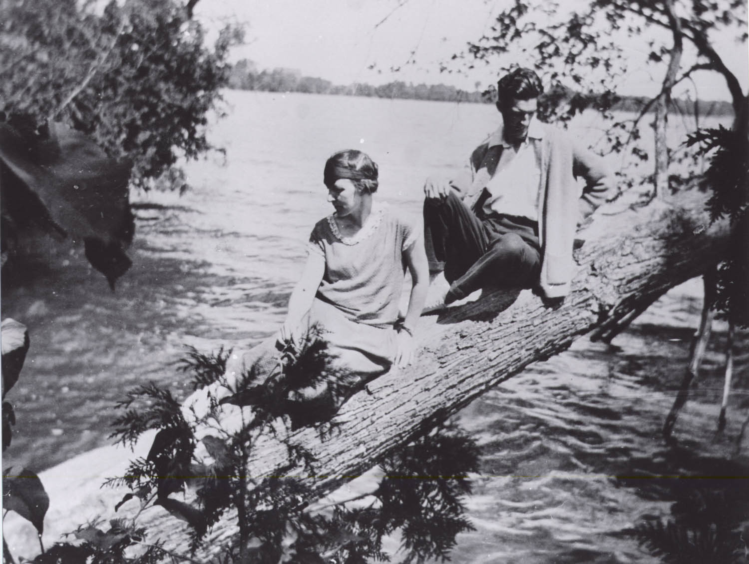 Photo of a couple relaxing on a tree trunk overhanging Lake Simcoe at Belle Ewart. The woman is wearing a long dress and headband, and the man is wearing slacks and a cardigan.