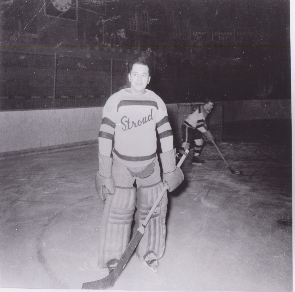 Photo of John "Johnny" Snache on the ice and in full gear wearing a Stroud jersey. Johnny was the goalie for the Stroud hockey team from 1946 to 1951. This information was taken from page 81 of the Stroud Tweedsmuir History Vol. II.