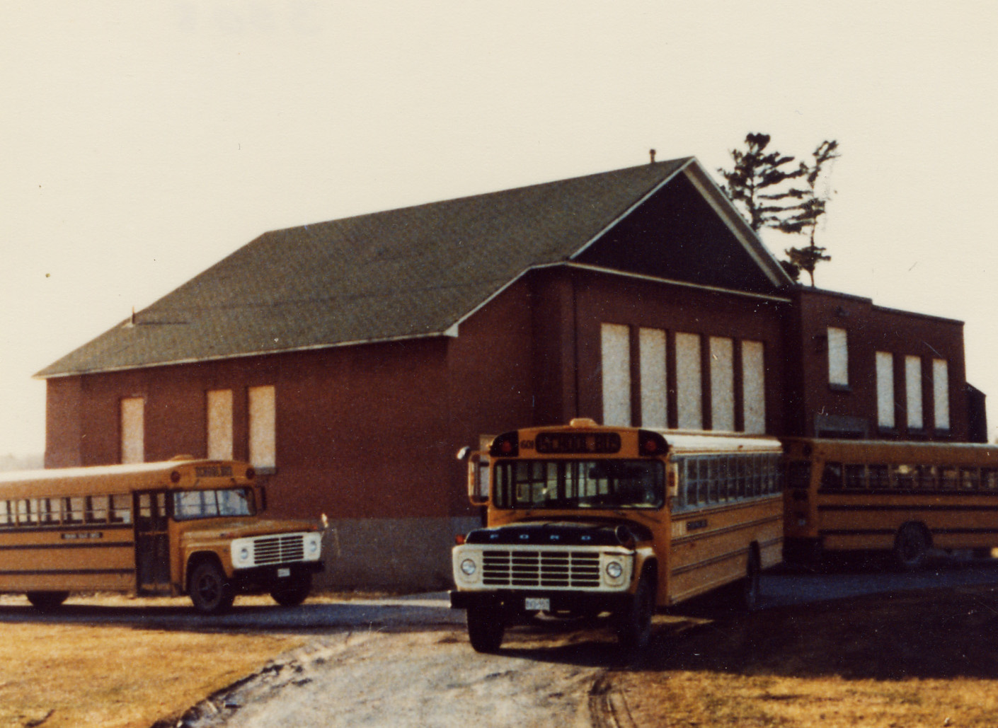 Lefroy Continuation School, 1926 - 1958, construction was hollow concrete block and brick. For a few years the building housed the Sheila Morrison School (until 1986). The part of the school to the left of the picture was the abandoned Presbyterion Church, after Church Union in 1925. It was converted to a two room school (Continuation) and opened in 1926. The entrance on the extreme left was added at this time, a short flight of steps to the basement. Stairs up to the main foyer (two windows) leading to classrooms left and right, with the Principal's office on the southwest corner (single window). In 1938 the part to the right was added, and Home Economics was taught upstairs and Industrial Arts in the basement. This was the first Home Economics and Industrial Arts in the County, as Barrie, or any of the other towns had not started to teach them yet. Due to a very progressive Continuation School Board from the Lefroy and Belle Ewart sections, and local pupils being able to attend as county pupils, an education up to Fourth Form (Grade 12) Home Economics and Industrial Arts was provided for the southeast part of the Township.