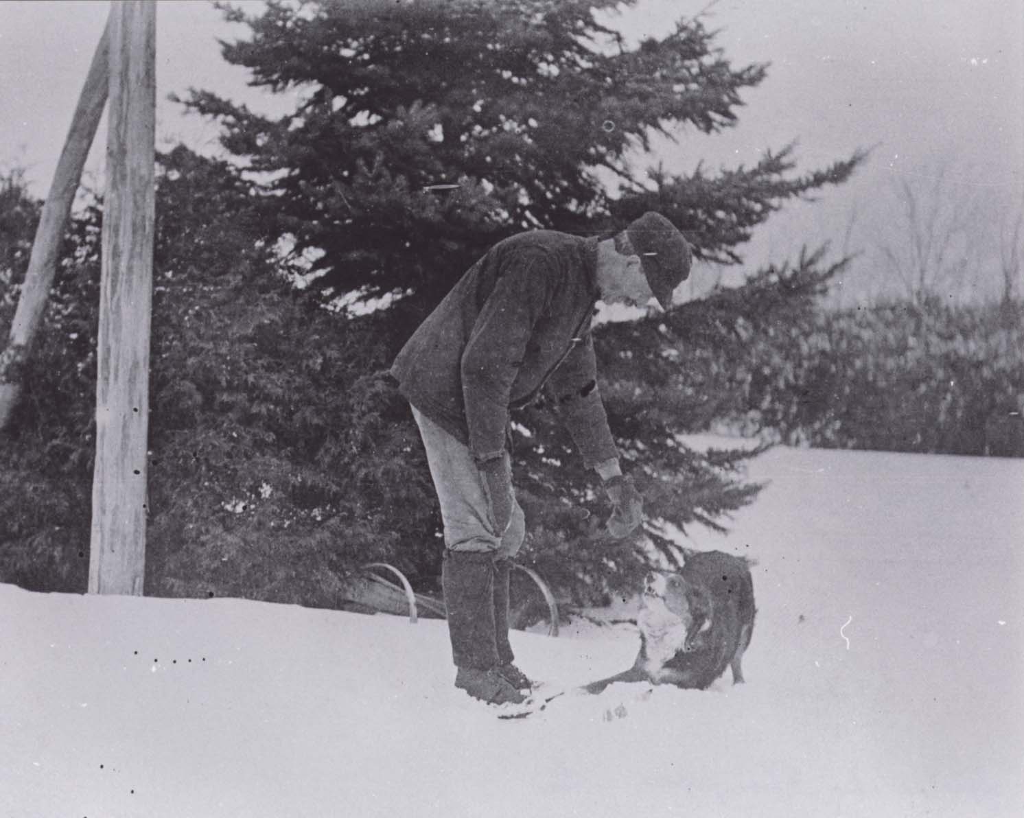 A man in winter clothing, John Thompson, bends at the waist to pet his eager dog, who is couching in the snow.