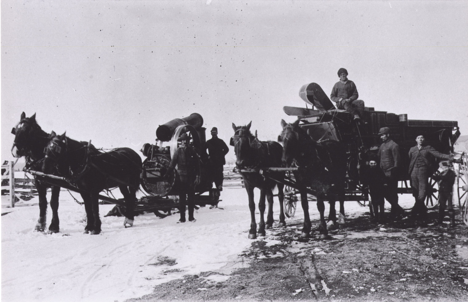 Photo of two steam power plants, one hauled by team and wagon and the other with a team and sleigh, used in this case for threshing clover. Typically after the threshing was over in the autumn, the clover mill started the rounds and visited farms with clover fields. It started later in the year, often with snow on the ground, because of a working theory that clover seeds threshed better in cold weather.