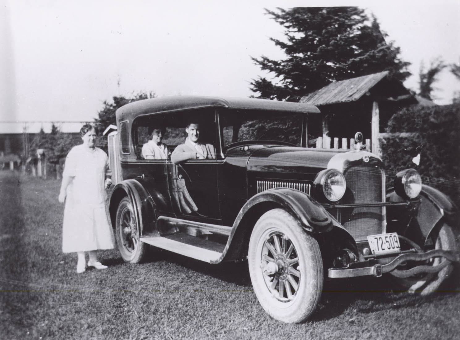 Image of a car parked on grass, taken in 1926. Mrs. Margaret Wisker stands next to the car, wearing a dress and her hair up. Robert Stewart sits in the drivers seat of the car and appears to be wearing a shirt and jacket. Ethel Wisker is sitting in the back row of the car, on the drivers side.