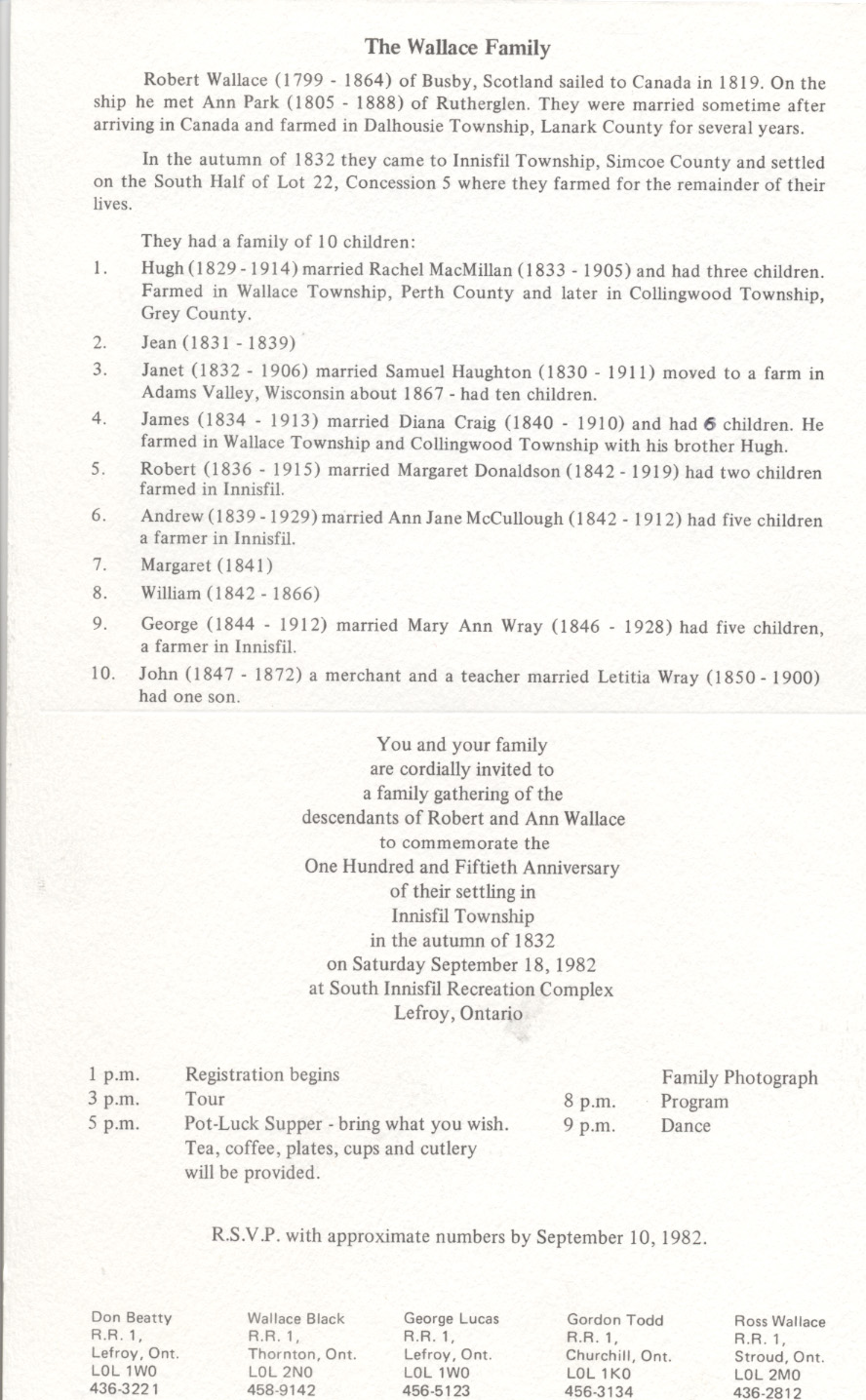 Invitation to Wallace Family Reunion at Lefroy on September 18, 1982 Social Events - Family Reunions