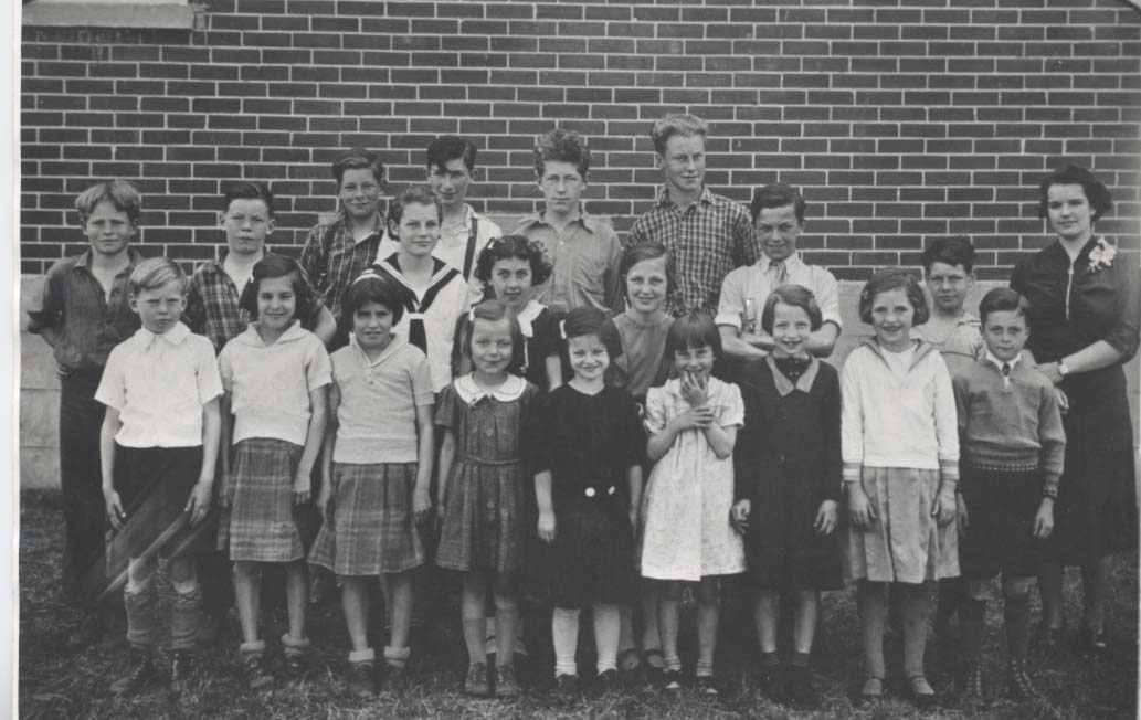 Bell Ewart School, Kathleen Houston, Teacher. Back row: Alfred Moore, Ernie Baxter, Ken Baxter, Gordon Ruffet, Barry Trombley, Burt Whan Second row: Lorne Baxter, Beth Chappel, Shirley Chappel, Mary Curtis, Juanita Mattier, Joyce Ferrier, Vera Forbes, Margaret Moore, Ronnie Trombley, Paul Trombley, Kathleen Houston, Teacher.