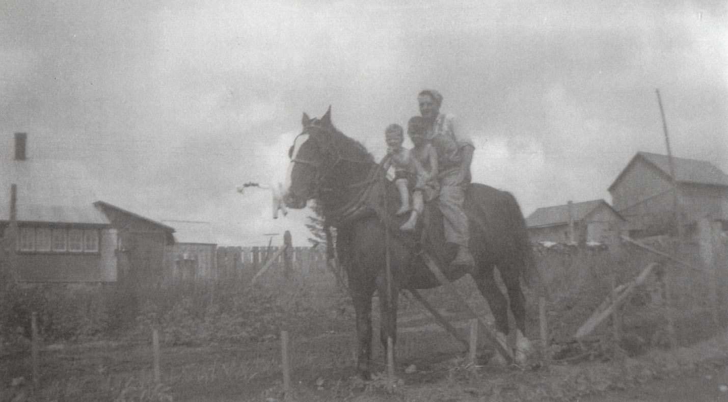 This is a picture of Bruce Wice, farmer, and his two young sons, Ross and Mervin scuffling the garden with horse, Laddie. Further information is available at the Knock Heritage Site