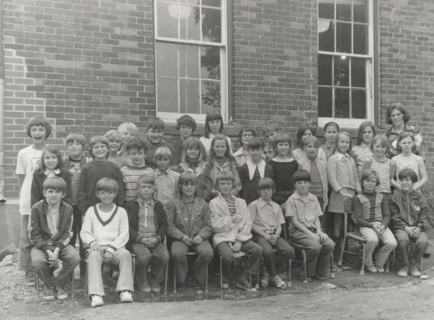 The last class in the old Painswick School: Back row: Darrell Nutt, Douglas Bowie, David Peyton, Douglas Bell, Chris Gans, Greg Monger, Sharon Monger, Linda Carleton, John Gracey, Sandra Caldron, Deanna Deachene, Shelly Dumont, Margaret Baker, Teacher Middle row: Marilyn Bateman, Steven Conners, Donald Smith, Stephen Turnball, Susan Sheridan, Lisa Graham, Cheryl Moore, Cathy Wallin, Marian Jonkman, Debbie Britton, Sherry Lee, Cheryl Braden Front row: Ricky Webb, Jimmy Thorn, Tim Lee, Clint Irwin, Jimmy Warnica, Ricky Broley, Wade Bulmer, Allan Amon, Robert Gilroy