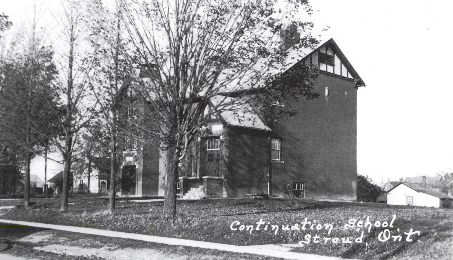 Post Card showing Stroud Continuation School which was built in 1923. On the left is showing part of the home that was owned in later years by Miss Mary Alice Cowan. The white house on the right - the home of Robert Archard Schools - Stroud Continuation school Architecture - buildings