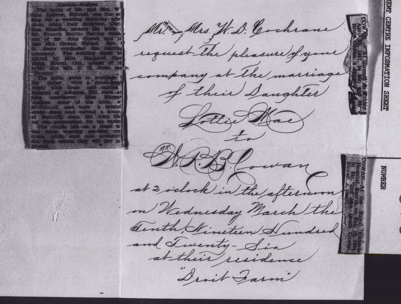 Wedding Invitation Re: Lottie Cochrane and Bruce Cowan. A Newspaper report of the wedding of Blanche Andrew and Frank Cowan Two Birth announcements (in newspaper) of Bruce Cowan's Children. Further information is available at the Knock Heritage Site