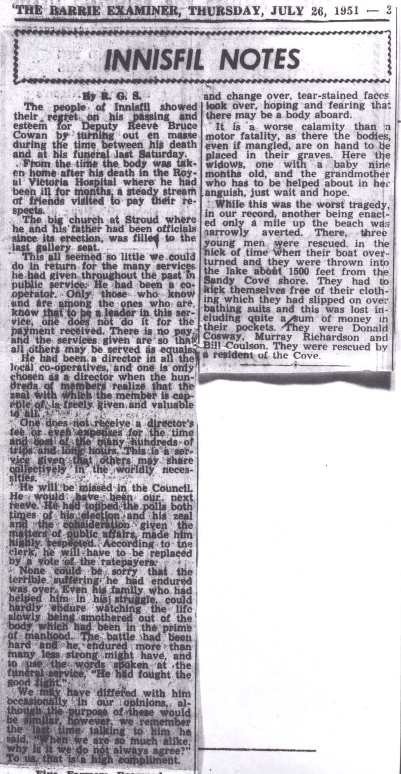 l. A tribute to Bruce Cowan by R.G.S. in Barrie Examiner 2. A report of 2 boating accidents in Innisfil in July 1951 by R.G.S. in Barrie Examiner Cowan, Bruce Disasters Cosway, Donald Richardson, Murray Coulson, Bill