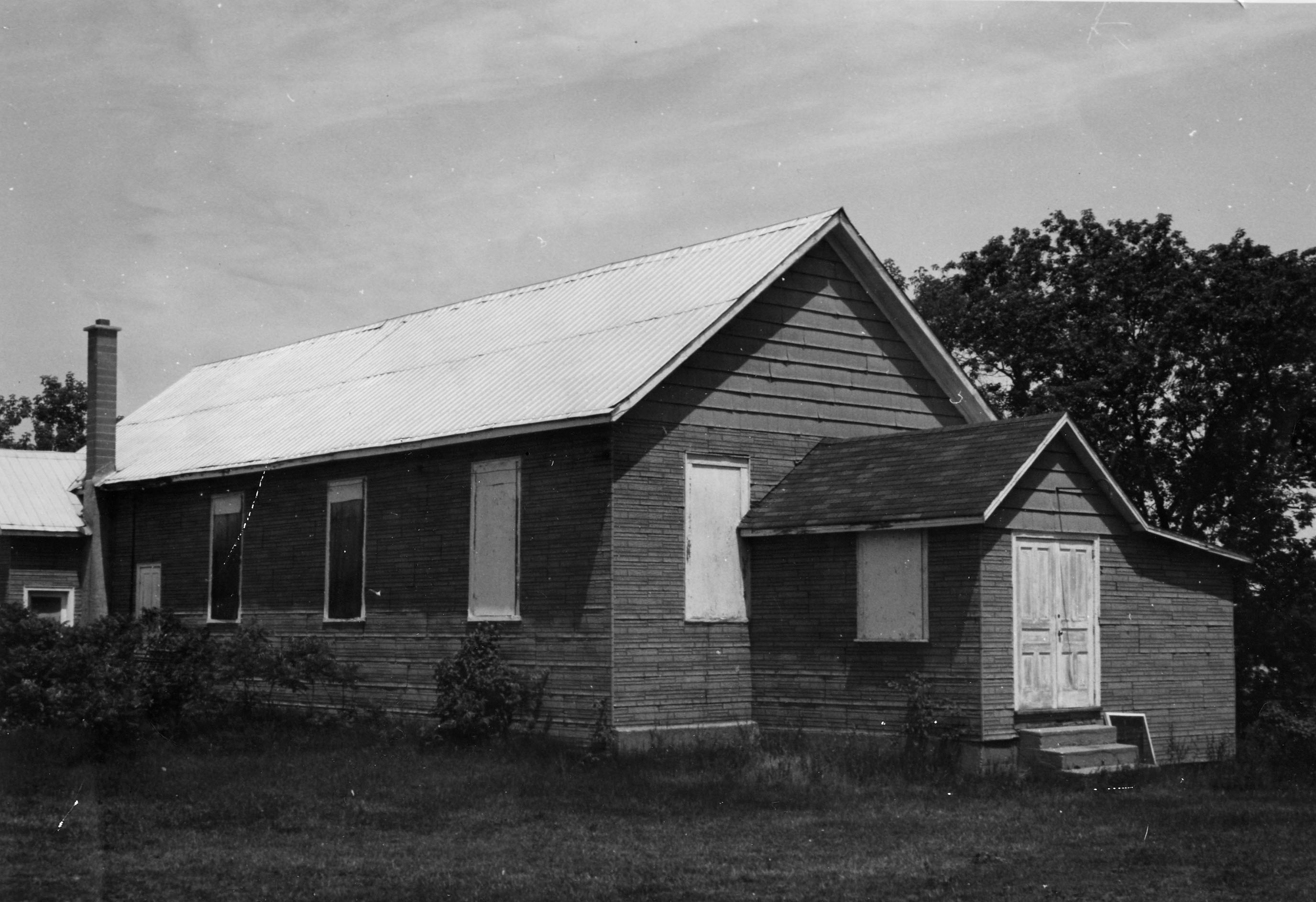 Photo taken by Clair Lehbery of the exterior of the Lefroy Community Hall. Originally known as the Grange Hall, it was built circa 1900 or earlier by the Grange organization of farmers. Supplies for the building were ordered in bulk, and the men who assisted in its construction were: James Allan, Walter Ralston, Charles Cross, William Kell, Frank Beatty, Fred Allan, Howard Allan, Walter Allan, Audis King, Chris Grose, Carley McCulloch, Dwight Rogerson, and W.C.W. McCullough. The Lefroy Continuation School was housed in the building from 1923-1927 where the first teacher was Jennie Henderson. From the mid-1950s until 1958 it was used as a public school. The Lefroy United Church later purchased the hall from the Township of Innisfil. The building itself has open gable roof and wood siding, and features a small extension on both the back and side.