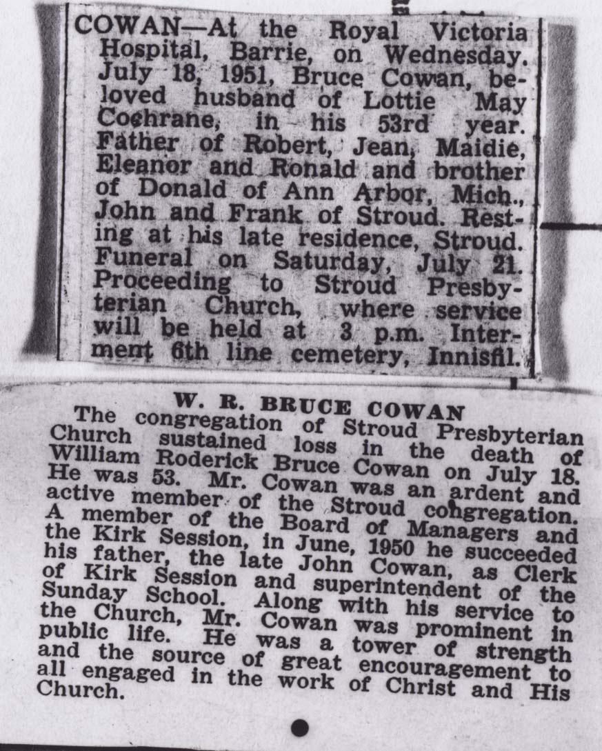 Newspaper (Barrie Examiner) report of the death of Bruce Cowan Social Events - funeral Cowan, Bruce