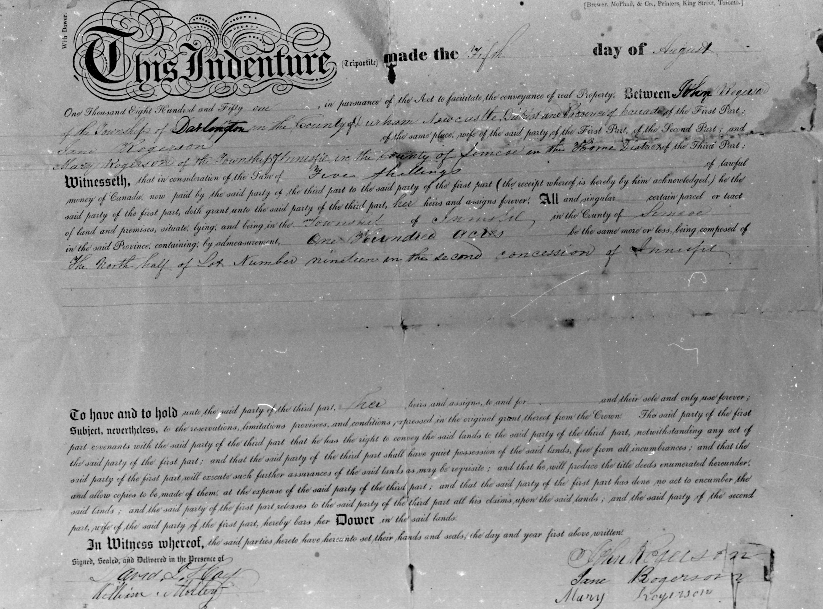 Black and white 8 x 10 photograph. REAL ESTATE INDENTURE OF SALE - ROGERSON JOHN