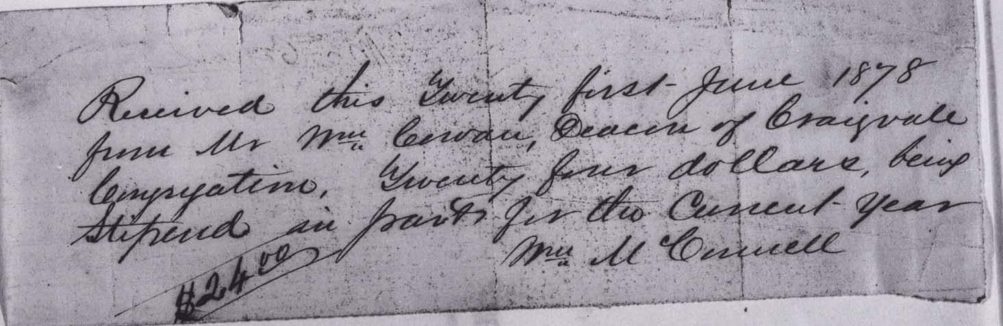 "Received this twenty-first June, 1878 from Mr. Wm. Cowan, Deacon of Craigvale Congregation, twenty four dollars, being stipend in part for the current year. Further information is available at the Knock Heritage Site