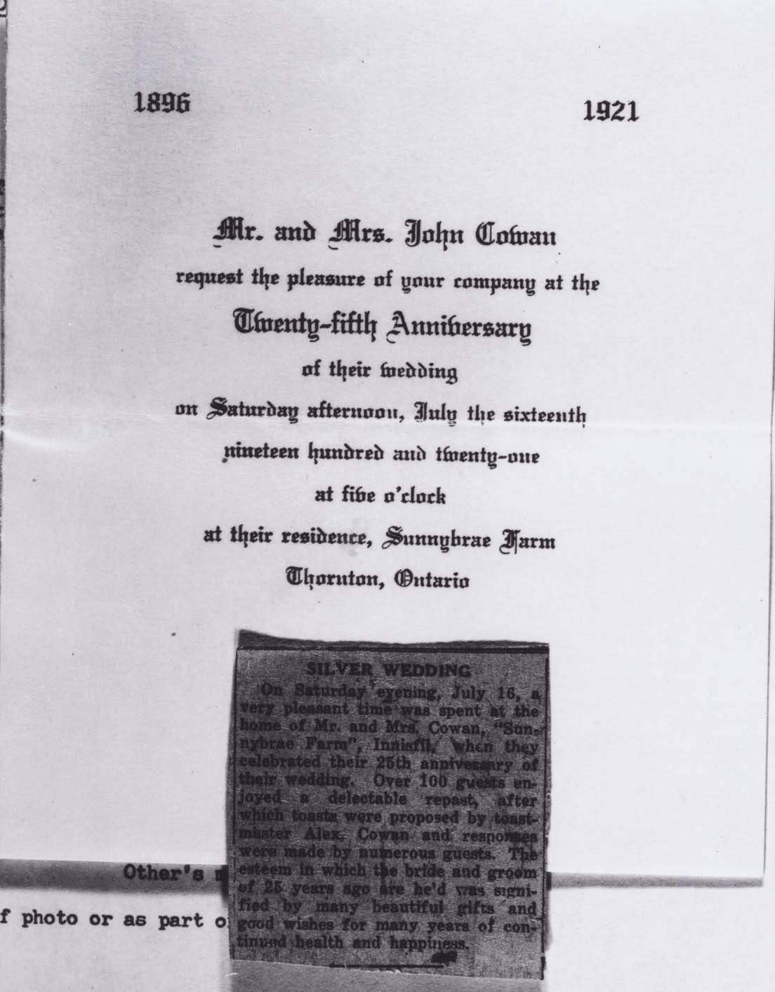 Invitation to and newspaper report of the Twenty-Fifth Wedding Anniversary of Mr. and Mrs. John Cowan. Further information is available at the Knock Heritage Site