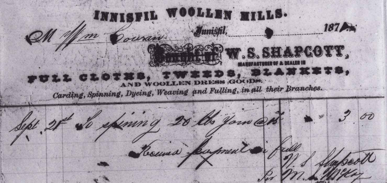 Invoice from Innisfil Woollen Mills 1871 (W.S. Shapcott) to William Cowan Cowan, William McKay, M.S.