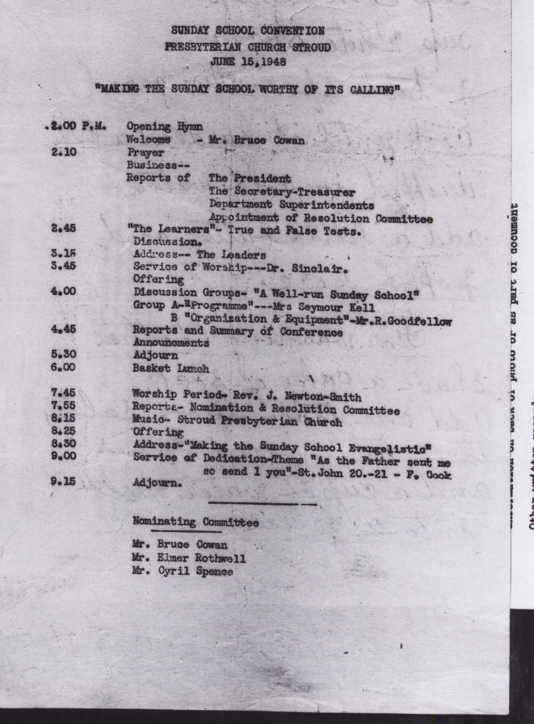 Image of a programme for the Sunday School Convention held at Stroud Presbyterian Church on 15 June 1948. On the reverse of the programme (not pictured) are two hand-written receipts for candy and washing clothes. This document and further information is available at the Knock Heritage Site