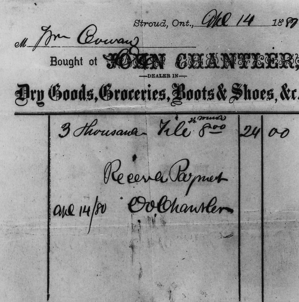 Invoice for 3,000 tile from John Chantler, dealer in dry goods, groceries, boots, shoes, etc., of Stroud to Wm. Cowan. The amount of $24.00 marked paid.