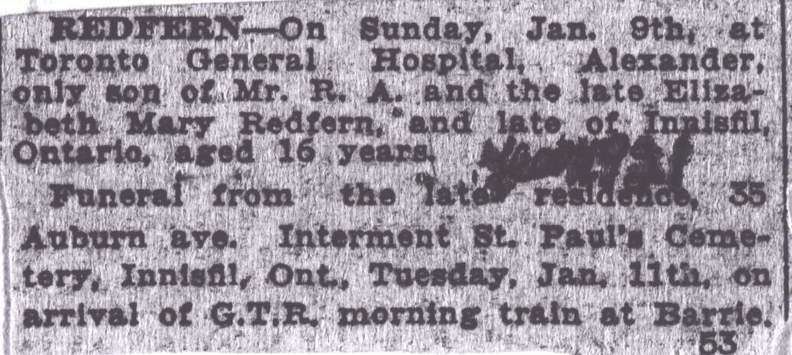 Obituary notice of Alexander Redfern. Death occurred Jan.9, 1921 Redfern, Alexander
