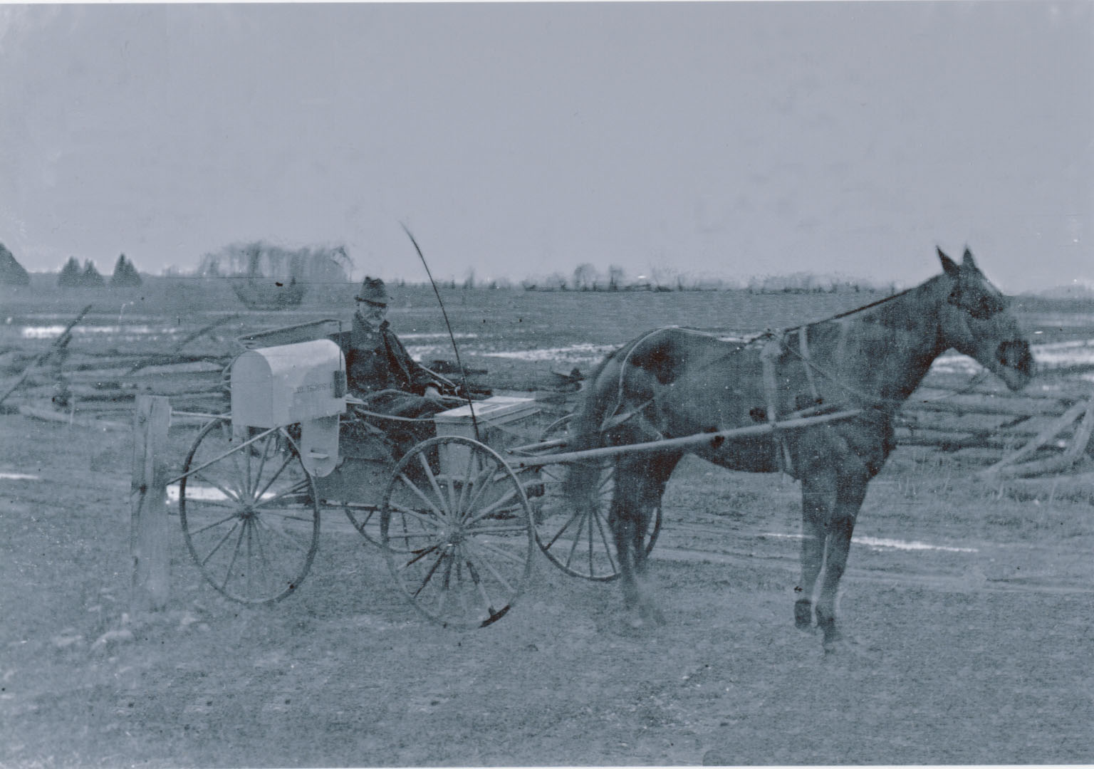 The mailman is delivering mail to the 8th Line mailbox of John Thompson, great uncle of Mildred Thompson Kellough. John Thompson was an accomplished photographer and worked from his studio at his farm house. Many local scenes and family portraits were captured by John. Further information is available at the Knock Heritage Site