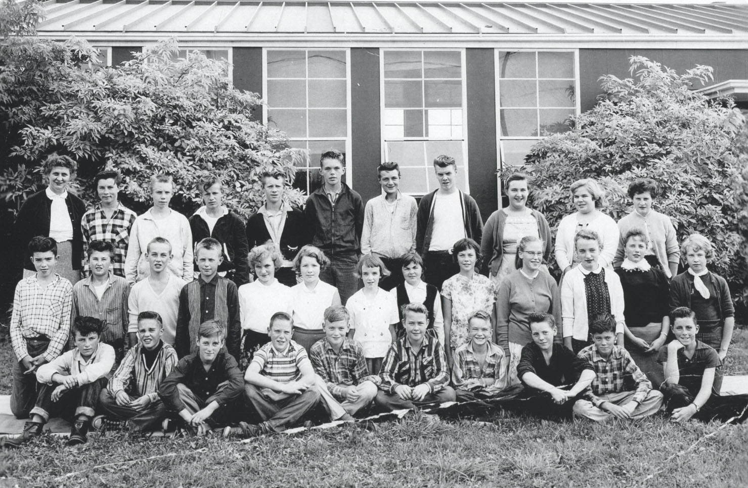 13A Huronia School, Huronia Road and the 10th Sideroad, Beth Bowman, Principal: Front row: Ken Morrow, Brian Bentley, Glen Crow, Joe__, Michal Newham, Henry Rumble, Paul Lackie, Gordon McKinnon, Larry Lloyd, Robert Mitchell Middle row: John Vieira, Mahlon Srigley, Ken Kroeker, Ken Smith, Georgina Noon, Rosemary Johnson, Elene Rodgers, Barbara Hoskin, Virginia Ortt, May Foster, Frances Belt, Elaine Rolfe, Sherry Campbell Third row: Ernest Amero, Lyn Smith, Dennis Corby, Fred Mason, Raymond Cromarty, Edward Irvine, Keith Chard, Karen Boyd, Joan Grozelle, Sharon Lewis.