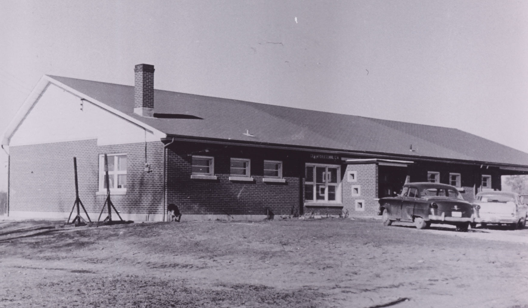 Black and white photo of Crawford Public School in the late 1950s. The school was built in 1953 and officially opened on 8 November 1954 as a result of a growing community need. Prior to the school's construction, children from the Tiffin Street area were required to take a Camp Borden bus to Copaco Corner (later the intersection of Innisfil and Tiffin Streets) and then travel by taxi to Holly School. Mr. William Crawford, grandfather of one of these students, donated land on Patterson Road on the condition that a school be built there. A second room was added in 1955, and a third room added in 1958. The first teacher was Mrs. Audrey Halfyard. The school was eventually closed and the building was used by the Simcoe County School Board as its South Regional Office. This photo shows the exterior of the building from the front left, with two 50s style cars parked in front of it.