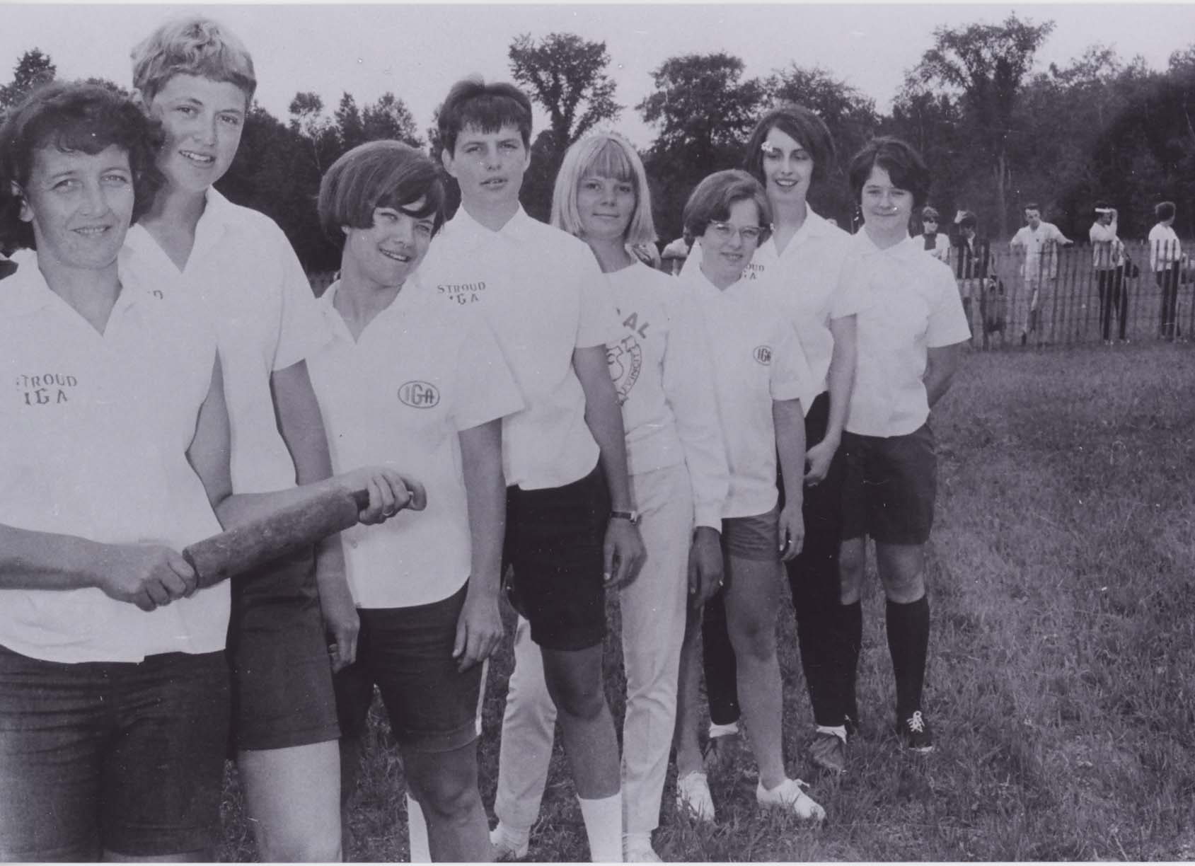 Rolling pin throwers. From the Stroud Tweedsmuir Histories. Left to right: Norine Skilleter, Nancy Campbell, Jane Small, Cathy Fisher, Donna Steenes, Chyrel Hubbert, Linda Campbell, Carolyn Armstrong.