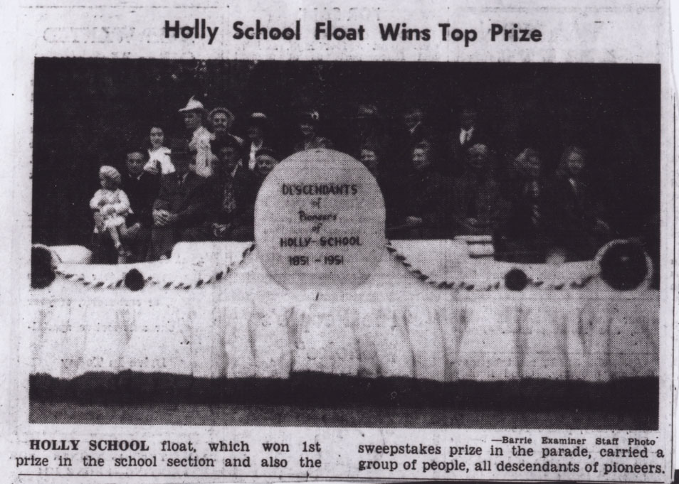 Clipping from Barrie Examiner re: Holly School float in Innisfil Centennial Parade. 1851 to 1951.