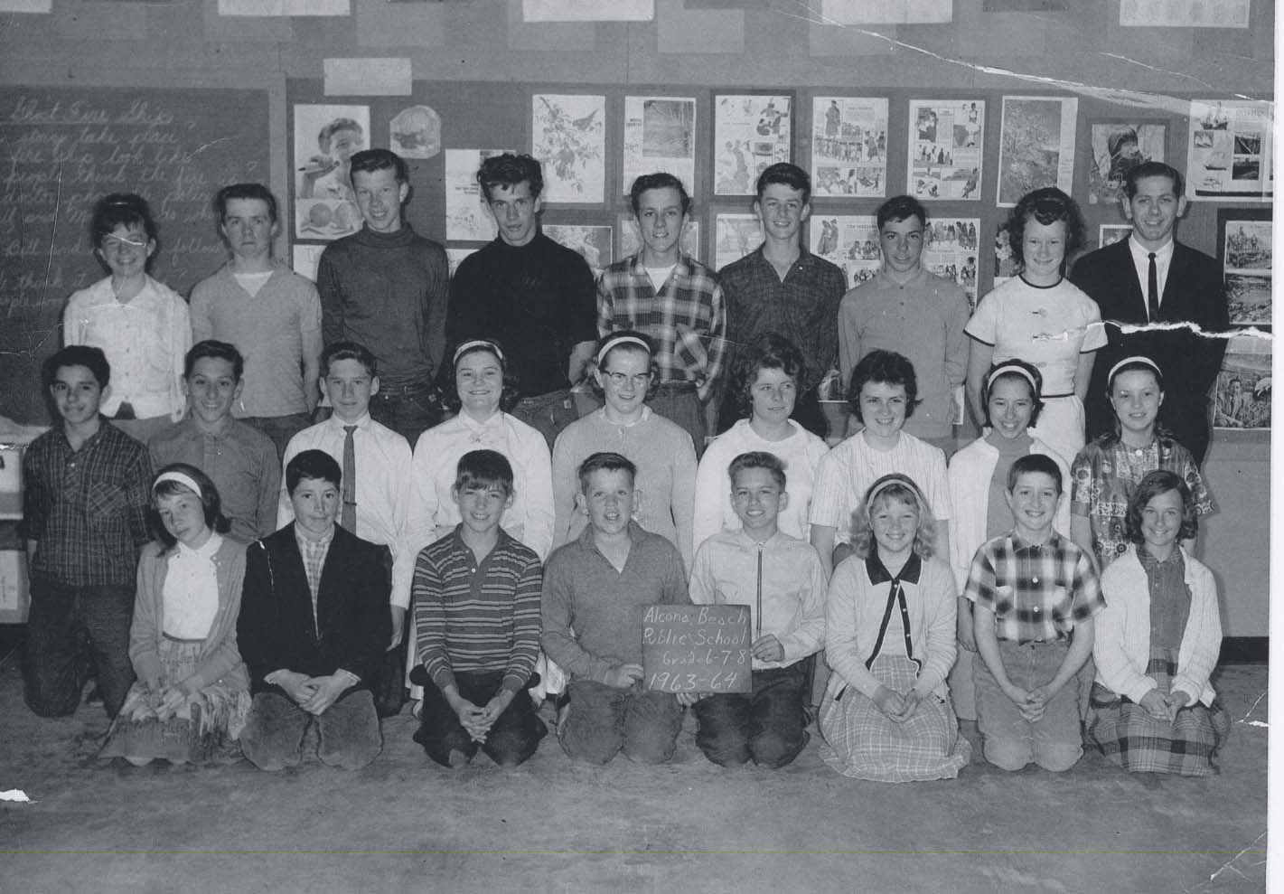 Alcona Beach Public School grade 6 to 8 class photo, 1963-64, with teacher Lloyd Ellesworth. Pictured from left to right - Front Row: Rebecca Fagents, Wynne Andrade, Bill Kennedy, John Gillespie, Larry Stoutenburg, Nancy Shepherd, Tim Andrade, and Cathy Yeates. Middle Row: Paul Hobeck, Leo Paquette, Ken Stoutenburg, Lois Watson, Barbara Law, Helen Macleod, Susan Wilson, Phyliss Imhoff, and Beverly Circelli. Back Row: Donelda MacLeod, Jim MacLeod, Frank Benson, Doug Warford, unknown, Barry Spillman, Harold Gould, Bonnie Spring, and Lloyd Ellesworth.
