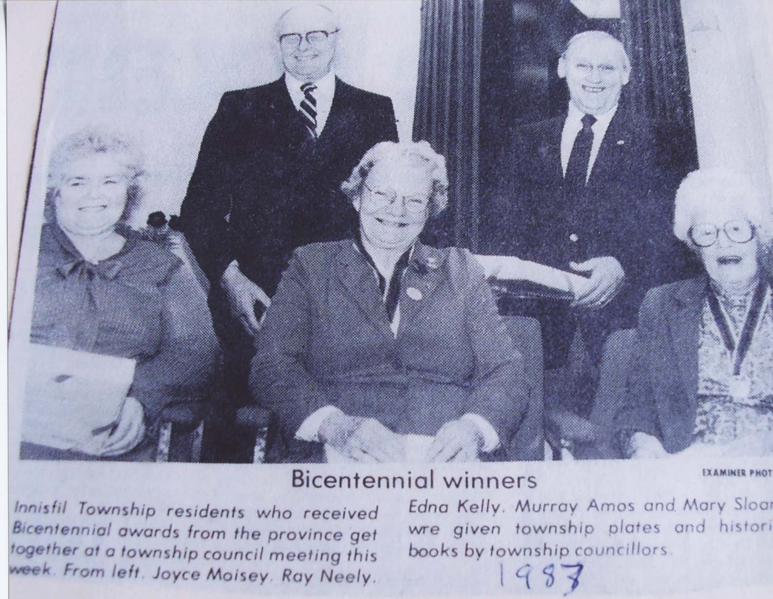 Provincial Bicentennial Award Winners:- Joyce Moisey, Ray Neely, Edna Kelly, Murray Amos and Mary Sloan were given township plates and historical books. Further information is available at the Knock Heritage Site