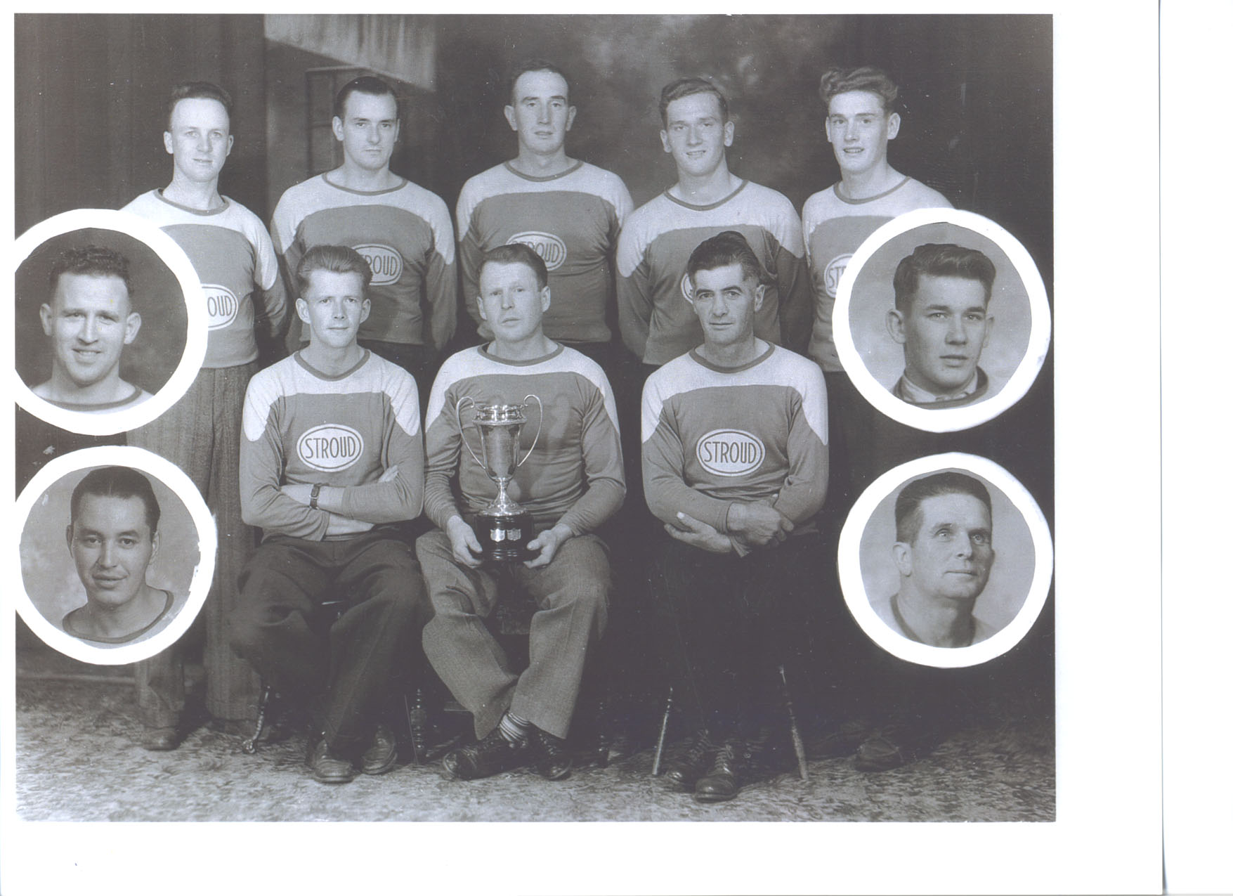 Team photo of the 1946 South Simcoe Softball Champions. The team is divided into two rows, with the back standing and the front seated, and they are all dressed in their team jerseys, which are two-toned and have "Stroud" written across the chest. The photo also features four other team members whose photos appear inset in white circles on either side of the picture. Pictured from left to right, back row: Ross Hubbert, Elwood Webb, Sheldon Bowman, John Bowman, and Austin Bowman. Front row: Budd Blaine (inset), Ralph Lennox, Jimmie Johnston holding trophy, manager Archie McNabb, and Billy Boychoff (inset). Bottom left inset: Johnny Snake. Bottom right inset: Dwight Nelson, coach.