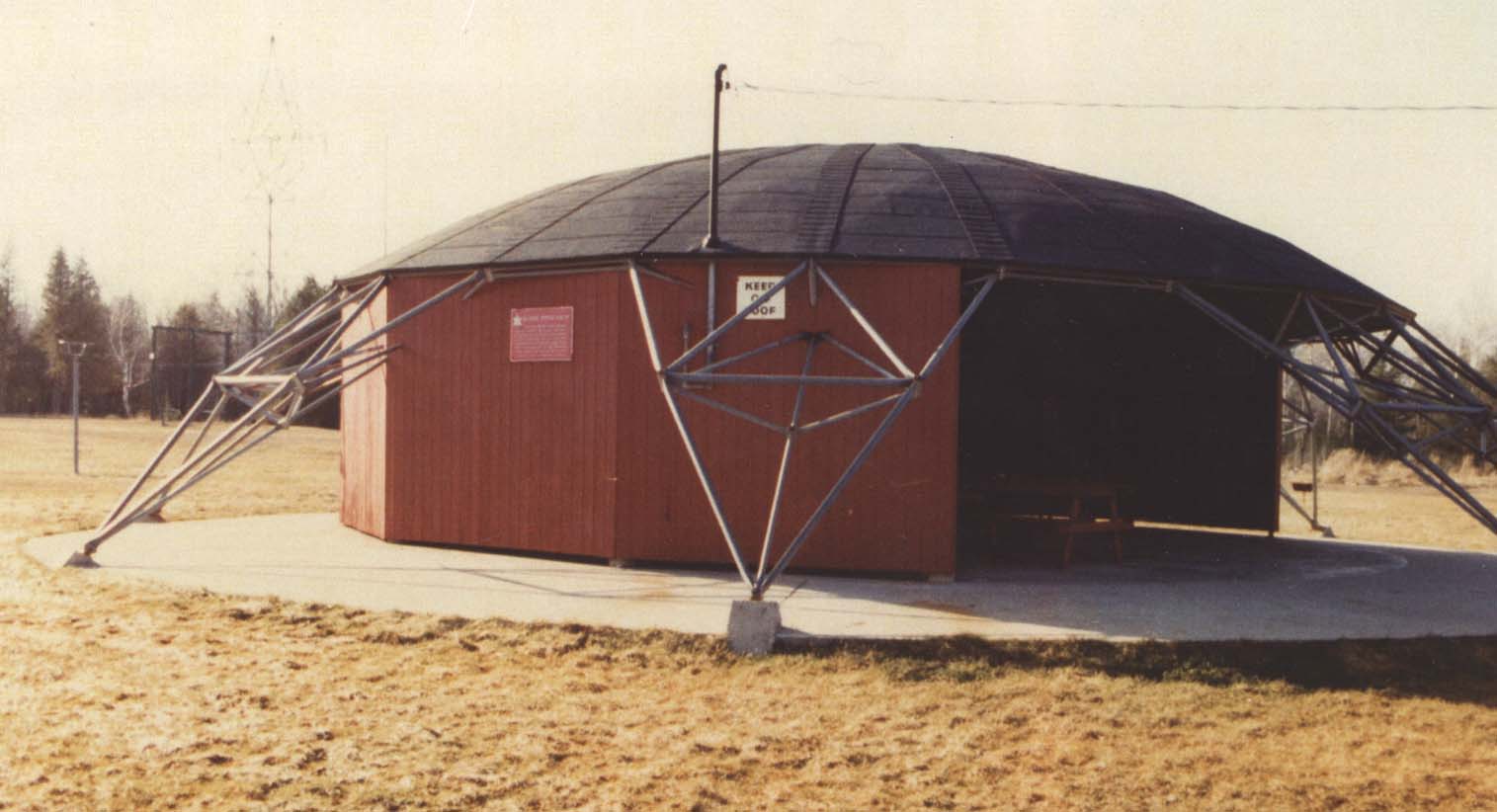 Photograph of a pavilion in Centennial Park. This park was created to celebrate Canada's Centennial in 1967. The pavilion itself was the site of many reunions, church services and children's day camps. A plaque was installed on the side of the pavilion with the following dedication: "This pavilion has been erected by the citizens of Innisfil Township in memory of the pioneers who through their hard work and sacrifices laid symbolically the corner stone long ago and to the men of our township who served and gave their lives to enable us to live in freedom and peace."